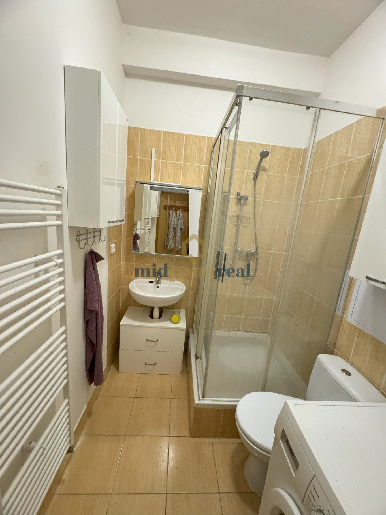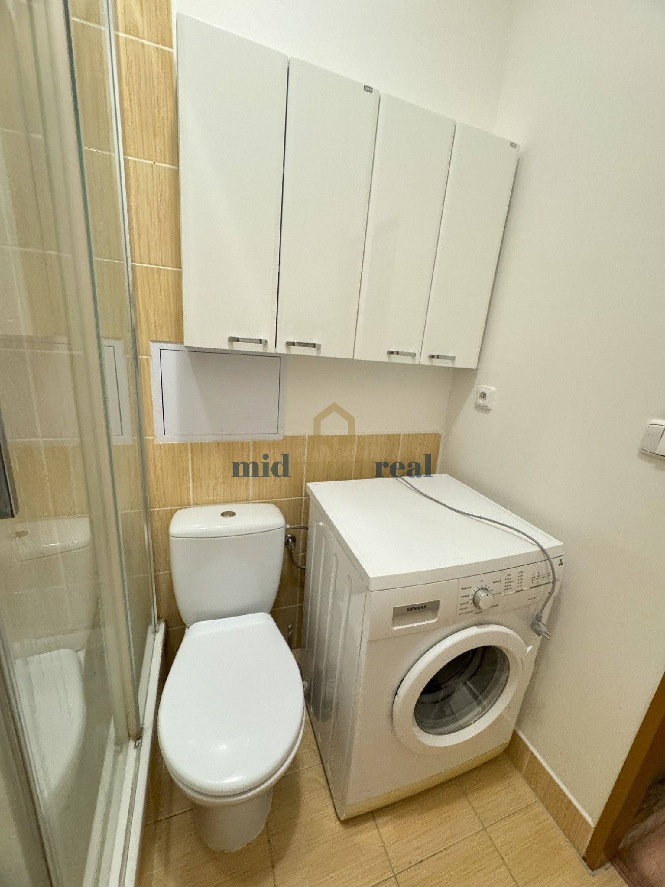 V kúpeľni sa nachádza umývadlo, kúpeľňový nábytok, práčka a sprchový kút, WC.